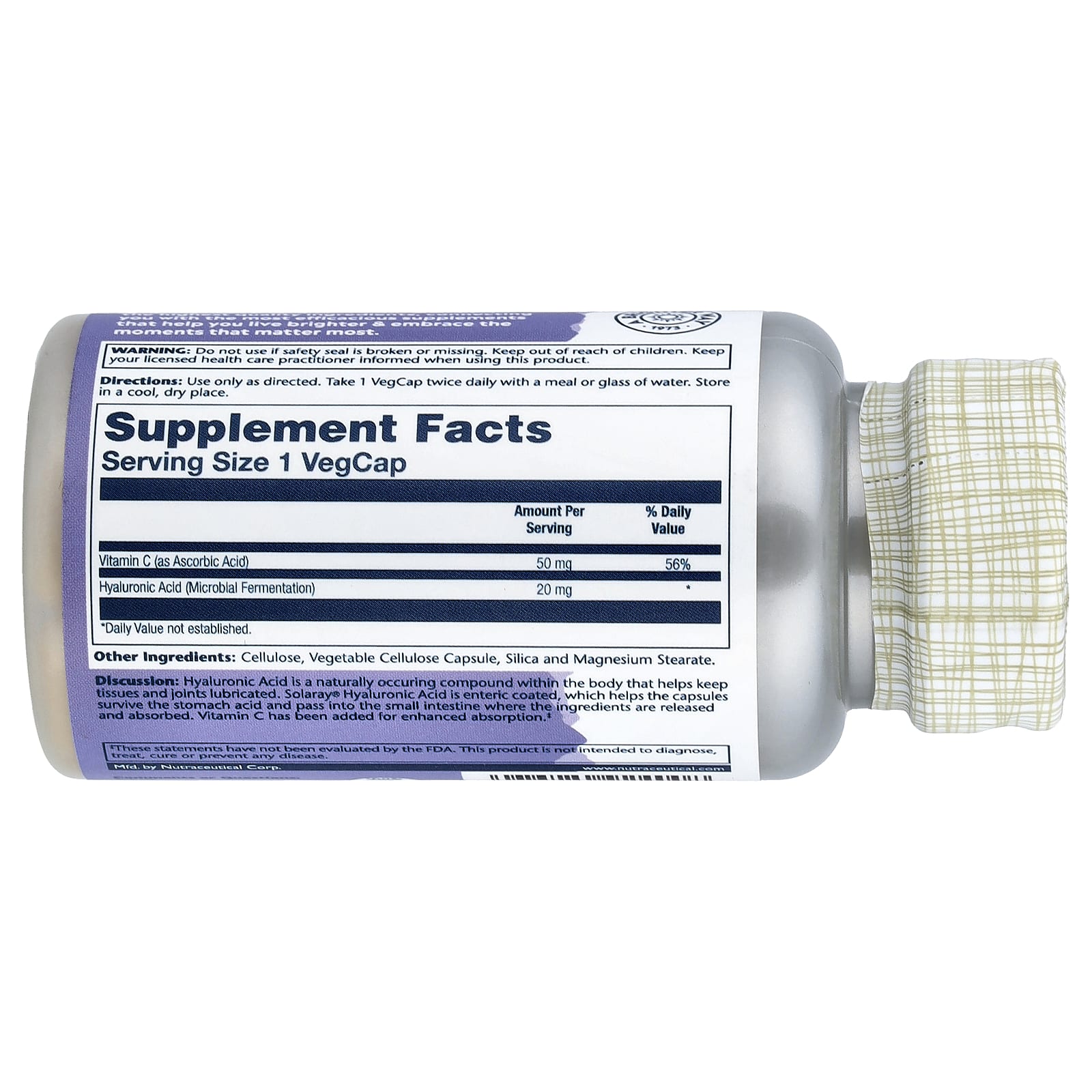 Análise: O Ácido Hialurônico é um composto de ocorrência natural no corpo que ajuda a manter os tecidos e as articulações lubrificadas. O Ácido Hialurônico Solaray® tem revestimento entérico, o que ajuda as cápsulas a sobreviverem ao ácido estomacal e a passarem para o intestino delgado, onde os ingredientes são liberados e absorvidos. A vitamina C foi adicionada para melhor absorção.
