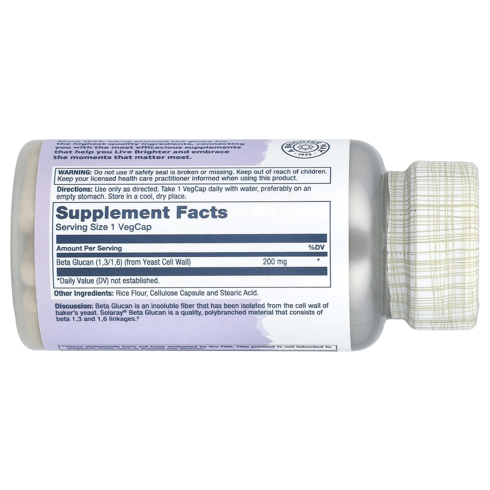 Análise: O Betaglucano é uma fibra insolúvel que foi isolada da parede celular do fermento de padeiro. O Betaglucano Solaray® é um material polirramificado de qualidade que consiste em ligações beta 1,3 e 1,6.