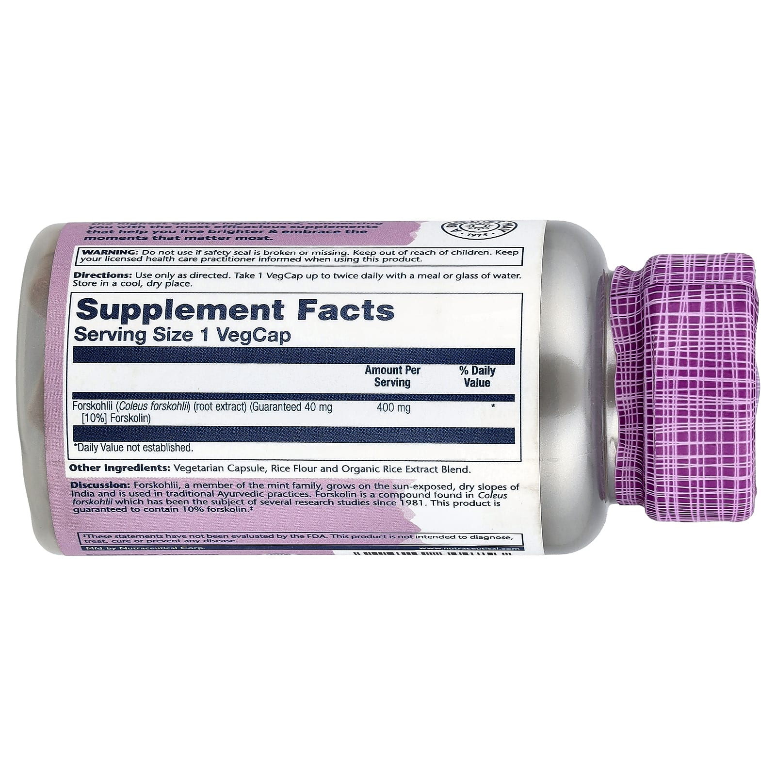 Análise: Forskohlii, um membro da família da menta, cresce nas encostas secas e expostas ao sol da Índia e é usada em práticas aiurvédicas tradicionais. A Forskolina é um composto encontrado no Coleus forskohlii que tem sido assunto de várias pesquisas desde 1981. Este produto tem garantia de conter 10% de forskolina.