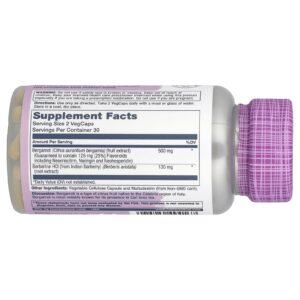 | Bergamota (Citrus aurantium bergamia) (extrato da fruta) (Garantido para conter 125 mg [25%] Flavonoides incluindo Neoeriocitrin, Naringin e Neohesperidin) |