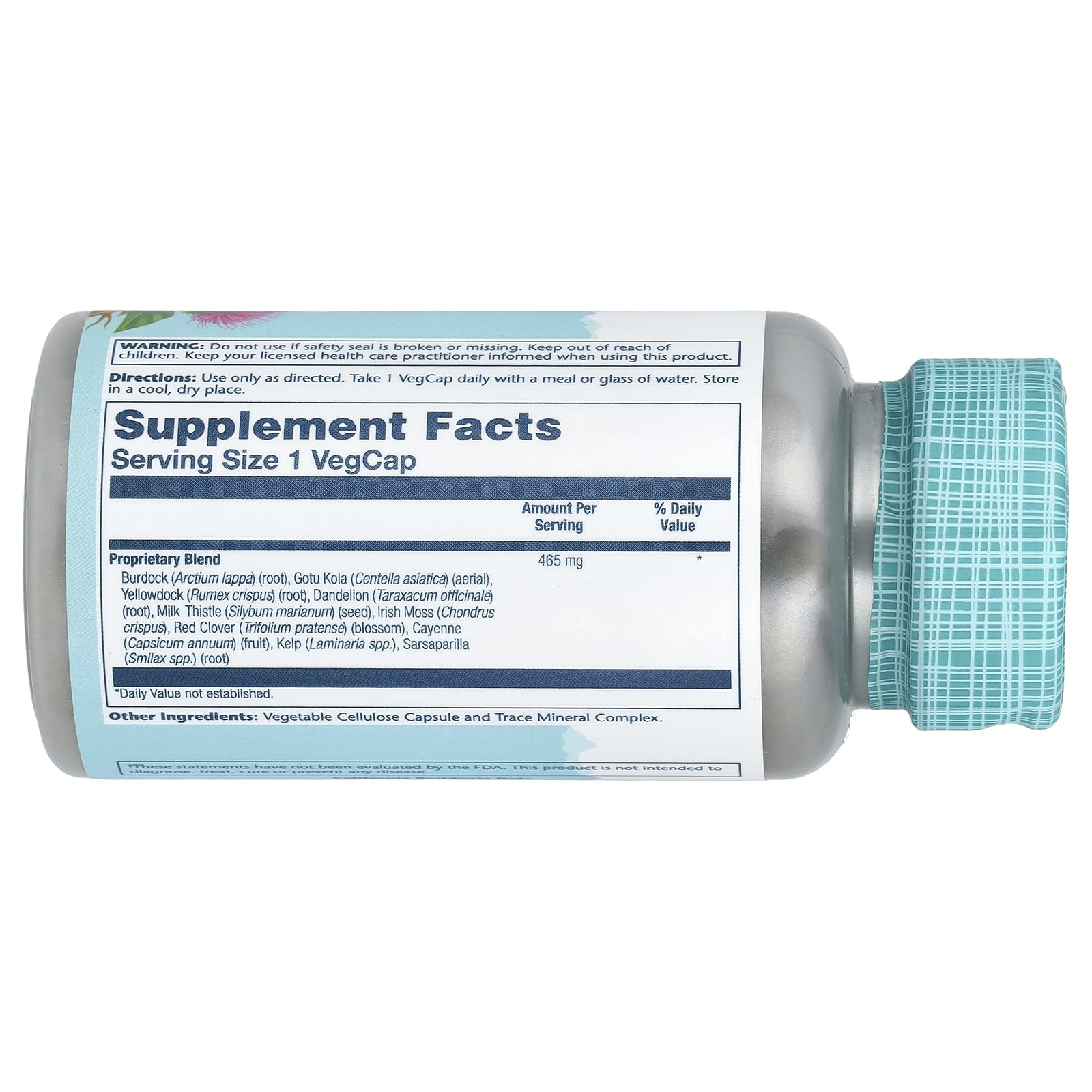 | Mistura Patenteada Bardana (Arctium lappa) (raiz), Gotu Kola (Centella asiatica) (parte aérea), Rumex crispus (raiz), Dente -de-leão (Taraxacum officinale) (raiz), Cardo -mariano (Silybum marianum) (semente), Musgo-da-Irlanda ( Chondrus crispus), Trevo Vermelho (Trifolium pratense) (flor), Caiena (Capsicum annuum) (fruta), Alga Marinha (Laminaria ssp.) Salsaparrilha (Smilax ssp.) (raiz) |