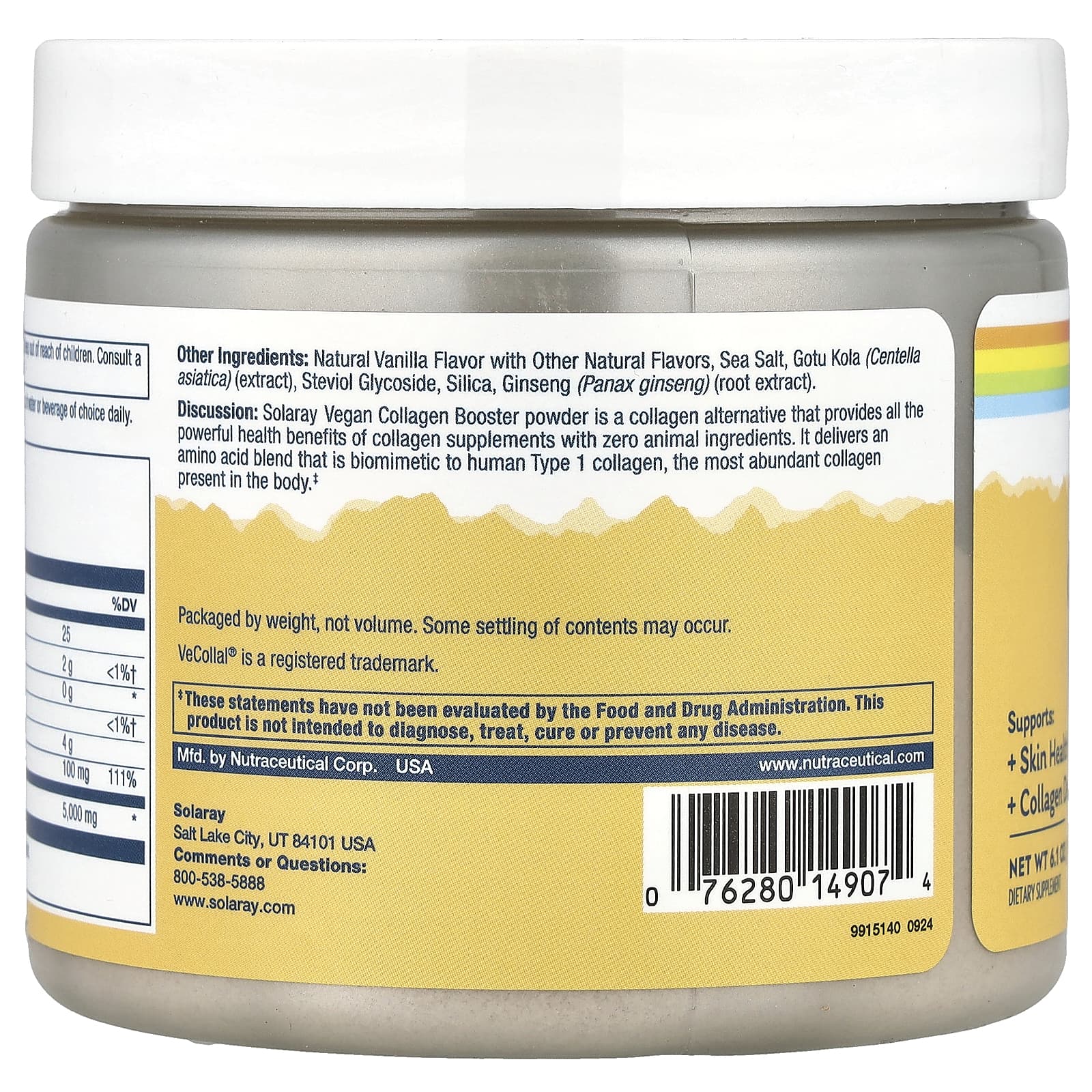 Solaray Pó Vegano de Reforço de Colágeno Baunilha Natural 173 g (61 oz) – Solaray Suplementos Ossos, Articulações e Cartilagem Colágeno, Suplementos.