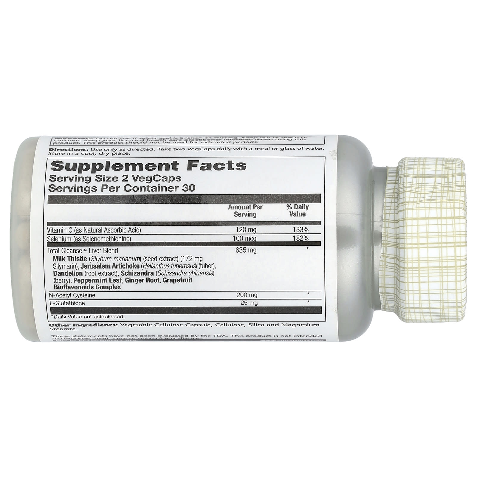 | Mistura para o Fígado Total Cleanse™ Cardo-mariano (Silybum marianum) (extrato da semente) (172 mg de Silimarina), Alcachofra de Jerusalém (Helianthus Tuberosus) (tubérculo), Dente-de-leão (extrato da raiz), Schizandra (Schisandra chinensis) (baga), Folha de Hortelã-Pimenta, Raiz de Gengibre, Complexo de Bioflavonoides de Toranja |