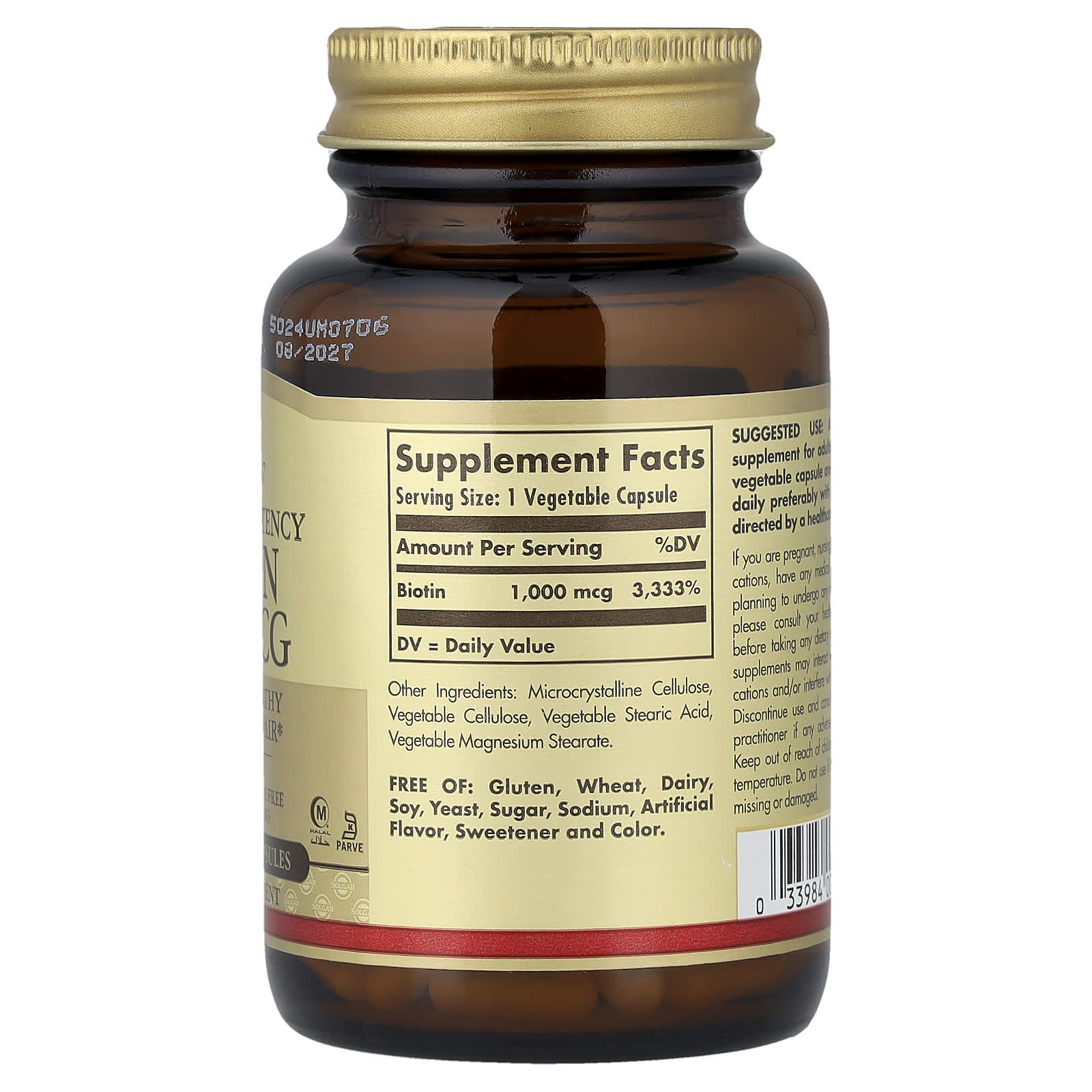 Solgar Biotina de Potência Aprimorada 1.000 mcg 100 Cápsulas Vegetais – Solgar Suplementos Cabelos, Pele e Unhas Vitamina B7 (Biotina).