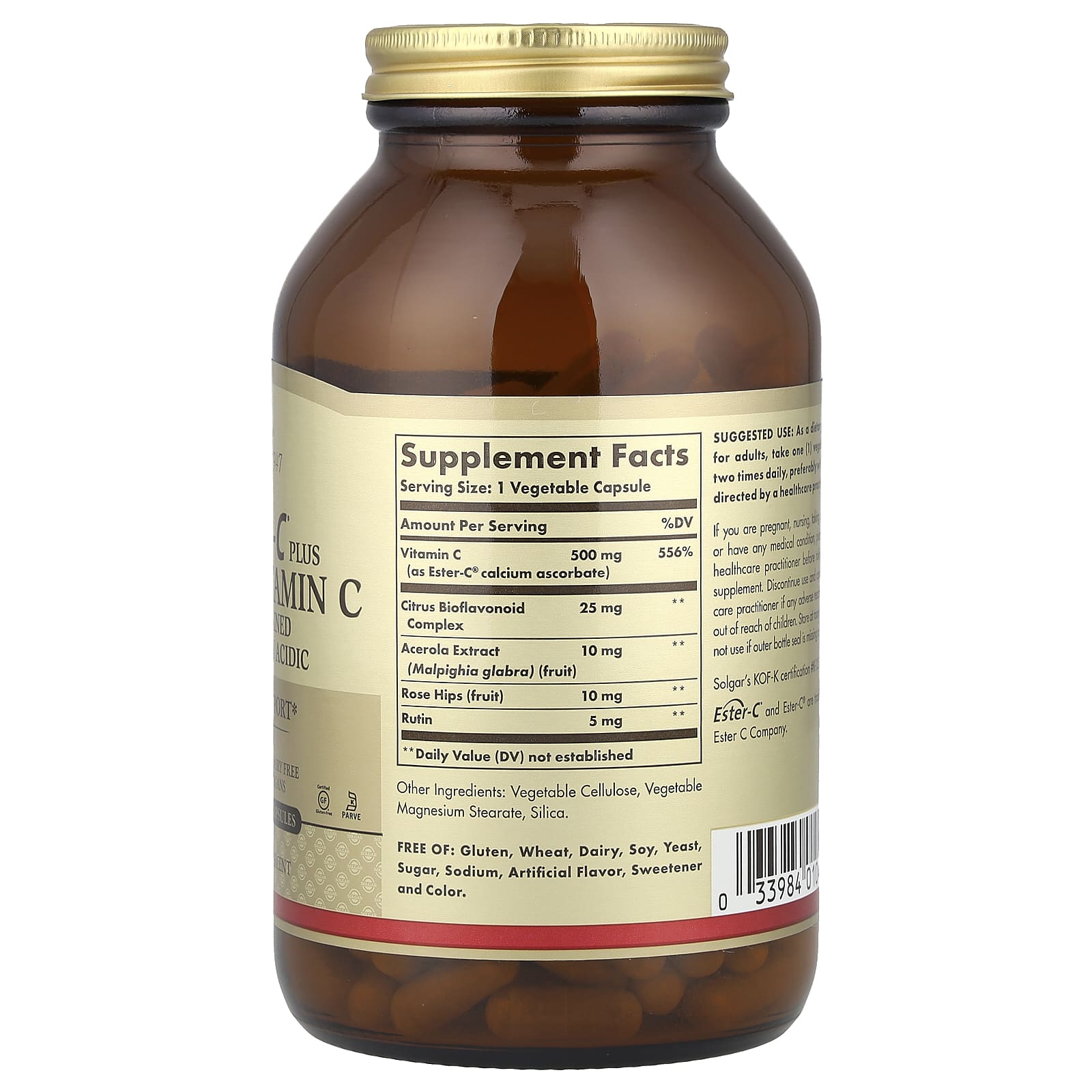 Ester-C® Plus é formulado exclusivamente pela Solgar® e fornece uma VitaminaC patenteada de pH neutro (não ácido) que é suave para o estômago. Os metabólitos da Vitamina C do Ester-C® afetam positivamente a retenção de Vitamina C nas células, fornecendo benefícios adicionais. Utilizamos um processo de fabricação especial para formar um exclusivo complexo metabólico de ascorbato de cálcio. Este complexo com boa retenção também contém bioflavonoides naturais e acerola, juntamente com fruto de rosa-mosqueta.
