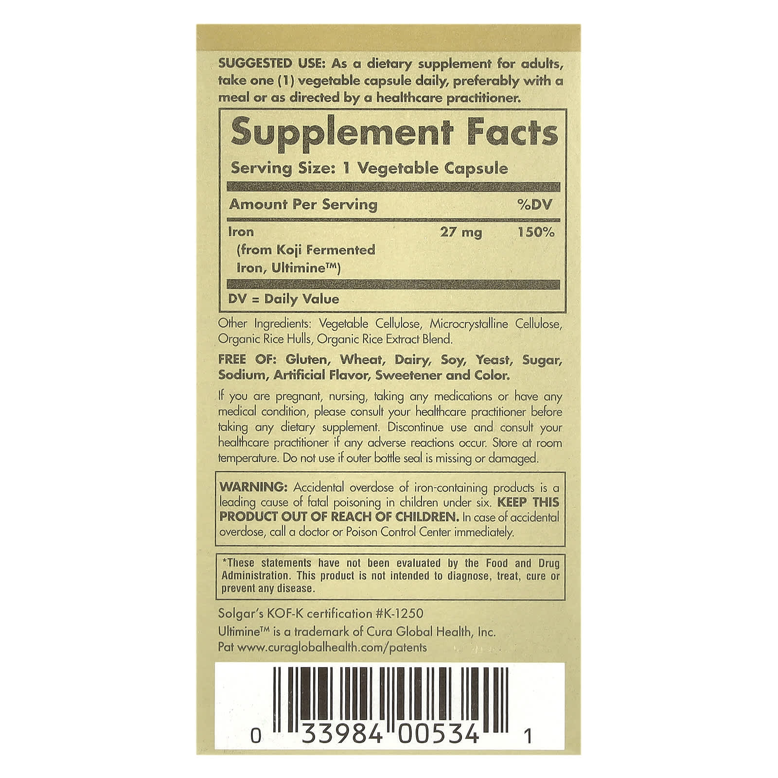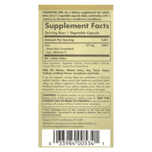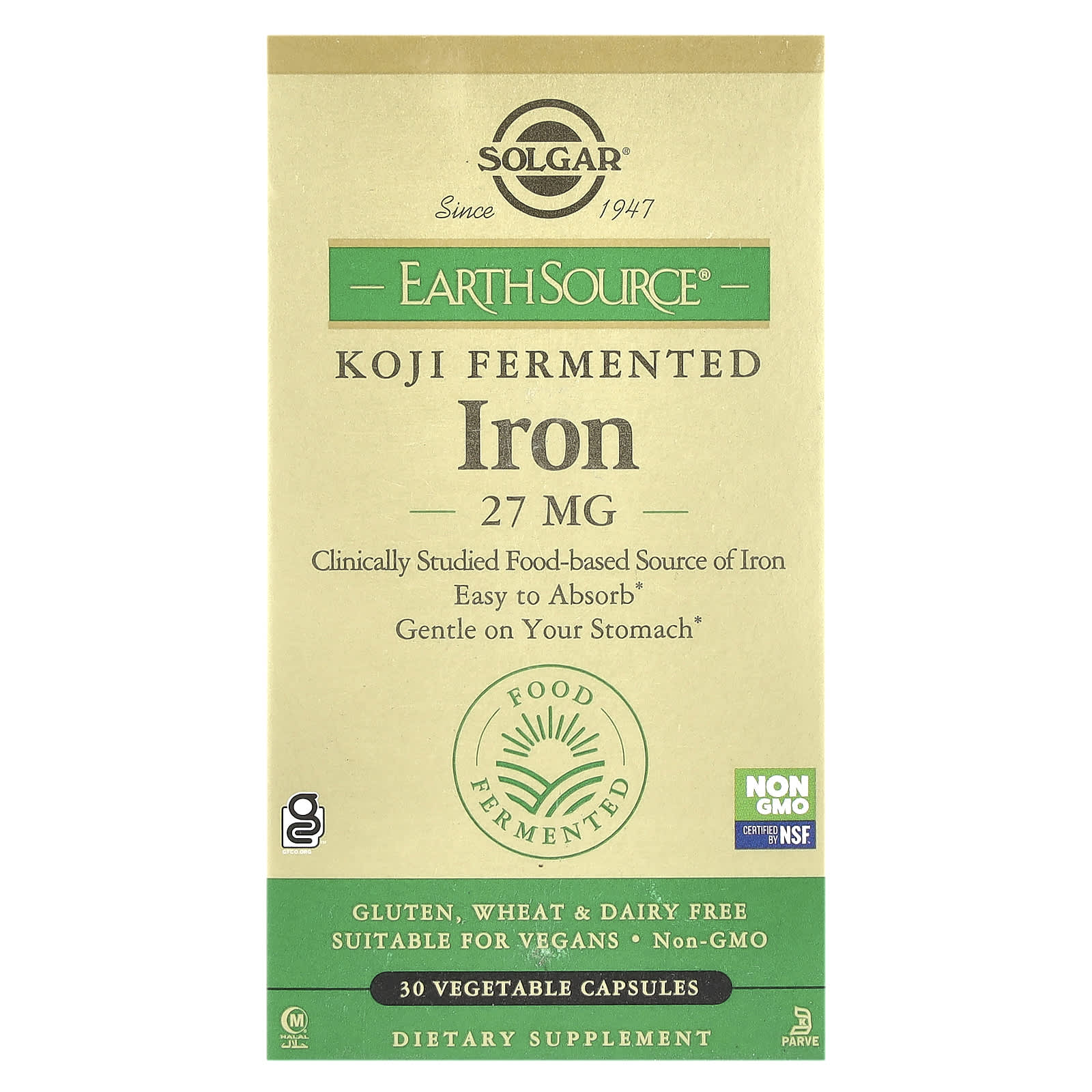 Solgar Fermentado de Koji da EarthSource® Ferro 27 mg 30 Cápsulas Vegetais – Solgar Suplementos Minerais Ferro.