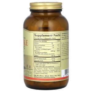 A vitamina C é uma vitamina solúvel em água que ajuda a combater os radicais livres, que podem levar ao estresse oxidativo e ao envelhecimento precoce das células. Uma de suas funções principais é a formação de colágeno, que é importante para a saúde da pele e das articulações. A vitamina C também desempenha um papel essencial no funcionamento dos glóbulos brancos, que são componentes vitais do sistema imunológico. Esta fórmula é oferecida em uma forma farmacêutica mastigável, que contém 1 grama de açúcar adicionado por porção.