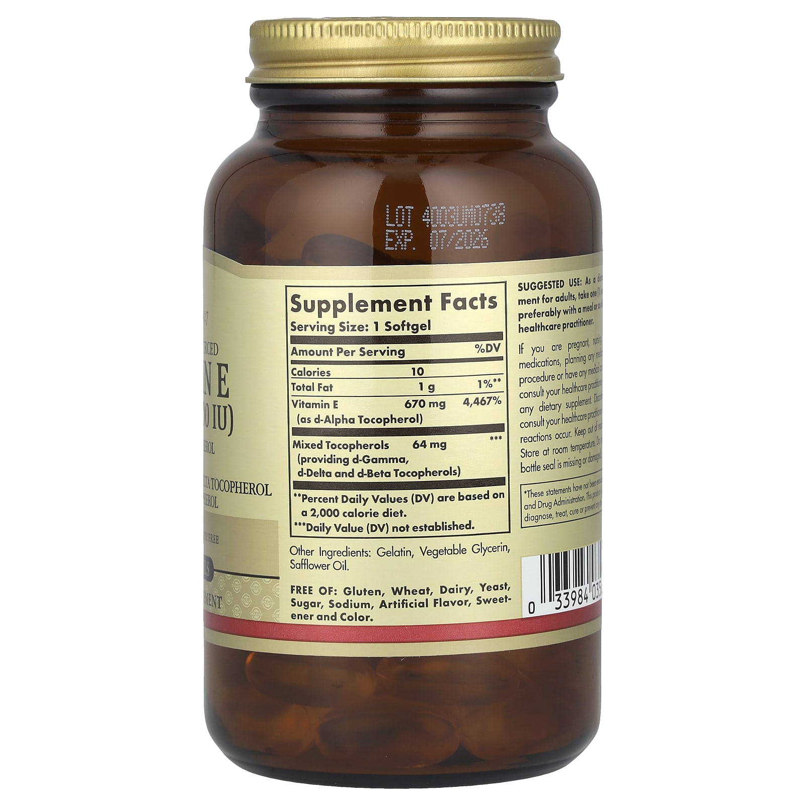 A vitamina E é um nutriente essencial e é o principal antioxidante solúvel em gordura do corpo. Ela fornece suporte nutricional para o sistema imunológico. Como antioxidante, a Vitamina E ajuda a combater os radicais livres no corpo. Os radicais livres podem causar estresse oxidativo e danificar as células. Esta formulação fornece uma fonte natural de Vitamina E como Dextroalfatocoferol e Tocoferóis mistos, incluindo d-Gama, d-Delta e d-Beta tocoferóis. Ela é oferecida em cápsulas softgel à base de óleo para promover absorção e assimilação ideais. Este produto contém 670 mg de Vitamina E, que também podem ser medidos como 1000 UI.