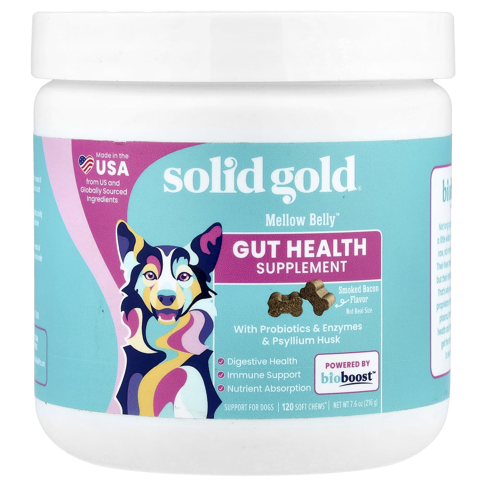 Solid Gold Mellow Belly™ Suplemento para a Saúde Intestinal Para Cães Bacon Defumado 120 Cápsulas Mastigáveis 216 g (76 oz) – Solid Gold Pets Suplementos para pets Suplementos para cães Probióticos para cães.
