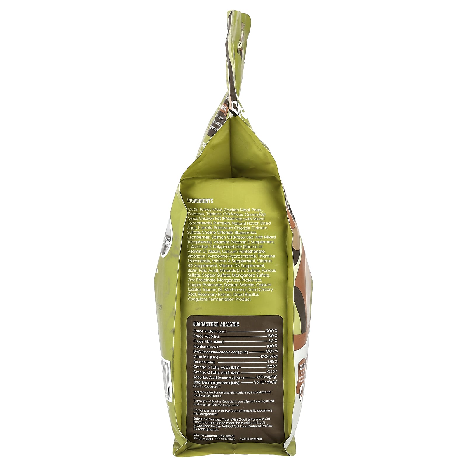 | *Não reconhecido como um nutriente essencial pela AAFCO Cat Food Nutrient Profiles †Bacillus coagulans LactoSpore®, LactoSpore® é uma marca registrada da Sabinsa Corporation. Contém uma fonte de microrganismos vivos (viáveis) de ocorrência natural. A Alimento para Gatos Macio Gold Wing Tiger com Codorna e Abóbora é formulada para atender aos níveis nutricionais estabelecidos pelos Perfis de Nutrientes para Manutenção da AAFCO Cat Food. |