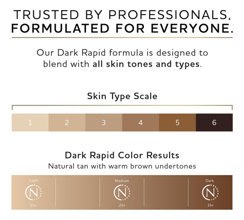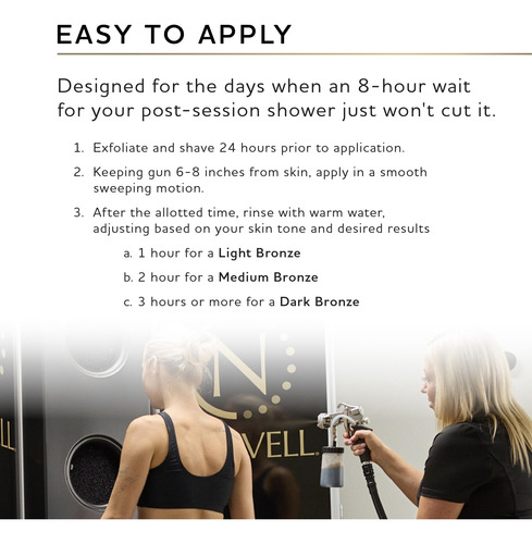 – RECOMENDAÇÃO NORVELL: 1 hora para bronze claro, 2 horas para bronze médio, 3 horas ou mais para bronze mais escuro. Enquanto os bronzeadores estéticos instantâneos desaparecem quando enxaguados com água morna, a cor sem sol continua a se desenvolver nas próximas 24 horas após a aplicação, com resultados que duram de 5 a 7 dias. Este produto foi projetado para uso em todos os sistemas de aerógrafo e HVLP, independentemente do fabricante.