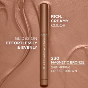 Sombra L'Oral Paris Makeup Le Shadow Stick, mesclável, resistente a manchas, sombra creme, bronze magnético 230 (marrom cobre cintilante) — melhore sua aparência: sua maquiagem não está completa sem o L'Oreal Paris Le Shadow Stick. Este bastão de sombra desliza sem esforço e de maneira uniforme para uma aparência rica em uma variedade de tons de pele. Experimente um nude ou marrom fosco, ou um champanhe cintilante ou lilás – Fácil aplicação: nossos bastões de sombra permitem uma aplicação rápida. A fórmula de sombra cremosa resistente a manchas e transferências cria e se mistura facilmente para uma aplicação uniforme e suave da maquiagem nos olhos. Como aplicar: aplique o bastão de sombra diretamente na pálpebra. Misture usando a ponta do dedo. Para criar uma aparência de várias tonalidades, aplique o bastão de sombra creme na linha dos cílios e misture com o dedo. Escolha entre 8 tons de sombras foscas e sombras brilhantes – Porque você vale a pena: crie a aparência que quiser com nossa linha completa de maquiagem, incluindo bases, corretivos, maquiagem iluminadora, lápis de sobrancelha, paletas de sombras, batons e muito mais – L'Oreal Paris Beauty: uma empresa líder em cuidados de beleza completos com sede em Paris, oferecemos produtos inovadores e experiência exclusiva de especialistas em maquiagem, cuidados com a pele, cuidados com o cabelo, estilo e cor do cabelo