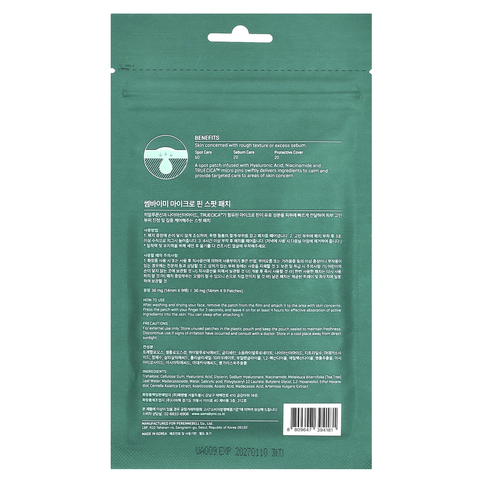 Trealose, goma de celulose, ácido hialurônico, glicerina, hialuronato de sódio, nicotinamida, água da folha de Melaleuca alternifolia (melaleuca), madecassoside, água, ácido salicílico, polyglyceryl-10 laurate, butilenoglicol, 1,2-hexanediol, ethyl hexanediol, extrato de Centella asiatica, asiaticosídeo, asiatic acid, ácido madecássico, extrato de Artemisia vulgaris.