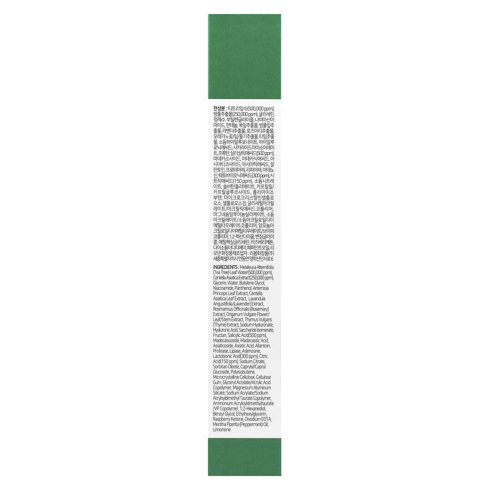 Água da folha de Melaleuca alternifolia (melaleuca) (500.000 ppm), extrato de Centella asiatica (250.000 ppm), glicerina, água, butilenoglicol, nicotinamida, pantenol, extrato da folha de Artemisia princeps, extrato da folha de Centella asiatica, extrato de Lavandula angustifolia (lavanda), extrato de Rosmarinus officinalis (alecrim), extrato da flor/folha/caule de Origanum vulgare, extrato de Thymus vulgaris (tomilho), hialuronato de sódio, ácido hialurônico, saccharide isomerate, fructan, ácido salicílico (500 ppm), madecassoside, madecassic acid, asiaticosídeo, asiatic acid, alantoína, protéase, lipase, adenosina, ácido lactobiônico (300 ppm), ácido cítrico (150 ppm), citrato de sódio, oleato de sorbitana, caprylyl/capryl glucoside, poli-isobutileno, celulose microcristalina, goma de celulose, glyceryl acrylate/acrylic acid copolymer, silicato de alumínio e magnésio, sodium acrylate/sodium acryloyldimethyl taurate copolymer, ammonium acryloyldimethyltaurate/vp copolymer, 1,2-hexanediol, benzyl glycol, ethylhexylglycerin, cetona de framboesa, edetato dissódico, óleo de Mentha piperita (hortelã-pimenta), limoneno.