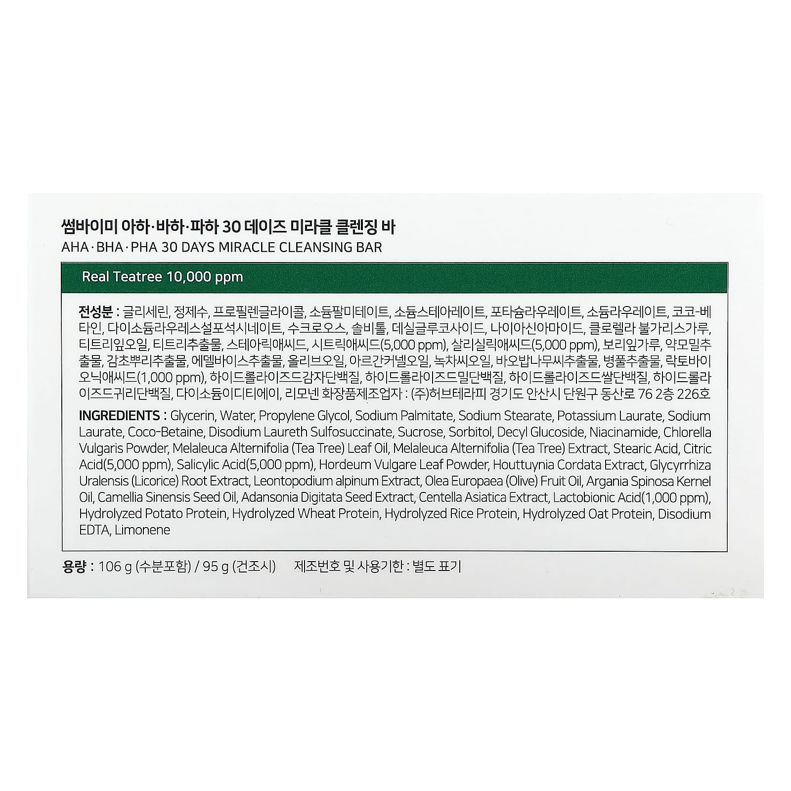 Glicerina, água, propilenoglicol, palmitato de sódio, estearato de sódio, laurato de potássio, sodium laurate, coco-betaine, disodium laureth sulfosuccinate, sacarose, sorbitol, decyl glucoside, nicotinamida, Chlorella vulgaris em pó, óleo da folha de Melaleuca alternifolia (melaleuca), extrato de Melaleuca alternifolia (melaleuca), ácido esteárico, ácido cítrico (5.000 ppm), ácido salicílico (5.000 ppm), folha de Hordeum vulgare em pó, extrato de Houttuynia cordata, extrato da raiz de Glycyrrhiza uralensis (alcaçuz), extrato de Leontopodium alpinum, óleo da fruta de Olea europaea (azeitona), óleo do grão de Argania spinosa, óleo da semente de Camellia sinensis, extrato da semente de Adansonia digitata, extrato de Centella asiatica, ácido lactobiônico (1.000 ppm), proteína de batata hidrolisada, proteína de trigo hidrolisada, proteína de arroz hidrolisada, proteína de aveia hidrolisada, edetato dissódico, limoneno.