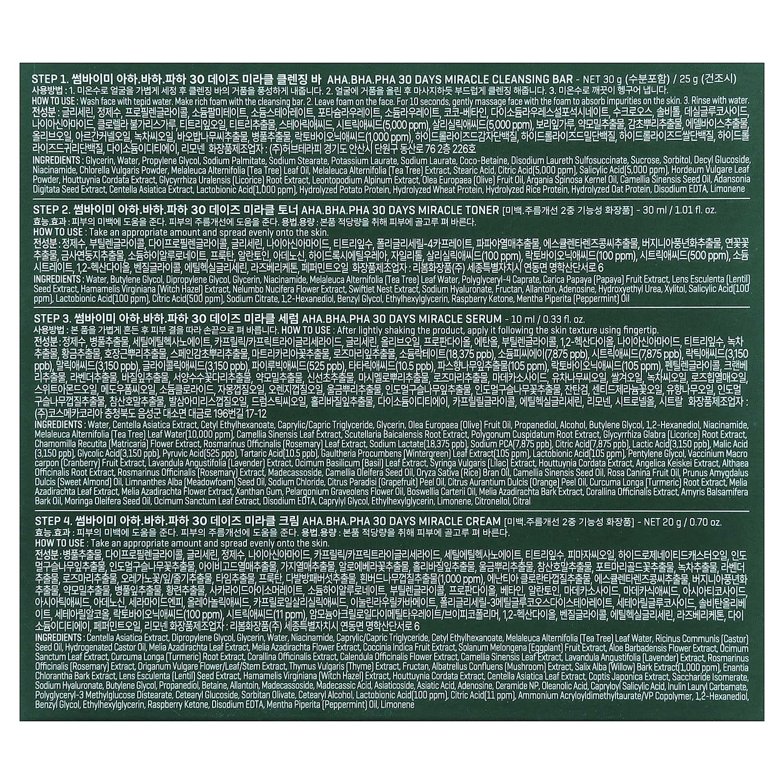 AHA, BHA, PHA 30 Day Miracle Tônico: Água, butilenoglicol, dipropilenoglicol, Glicerina, Niacinamida, água da folha de Melaleuca alternifolia (melaleuca), polyglyceryl-4 caprate, Carica papaya ³mamão™; extrato da fruta, extrato da semente de Lens esculenta (lentilha), extrato de Hamamelis virginiana (hamamélis), Extrato de flor de nelumbo nucifera, extrato de andorinhão, hialuronato de sódio, frutano, alantoína, adenosina, hydroxyethyl urea, xilitol, ácido salicílico (100 ppm), ácido lactobiônico (100 ppm), ácido cítrico (500 ppm), citrato de sódio, 1,2-hexanodiol, benzilglicol, etilhexilglicerina, cetona de framboesa, óleo de Mentha piperita (hortelã-pimenta).