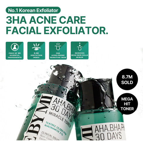 • MIRACLE TONER: O toner coreano ajuda a refinar a textura da pele na primeira etapa do cuidado, garantindo uma base suave para a maquiagem. Este toner AHA BHA é particularmente eficaz devido à sua inclusão de ingredientes, que esfoliam suavemente as células mortas e impurezas da pele, deixando o pele clara e lisa. Além disso, a alta concentração de extrato de tea tree neste tônico para cuidados com os poros acalma e trata a pele problemática, tornando-o uma parte essencial de qualquer rotina de cuidados com a pele coreana.