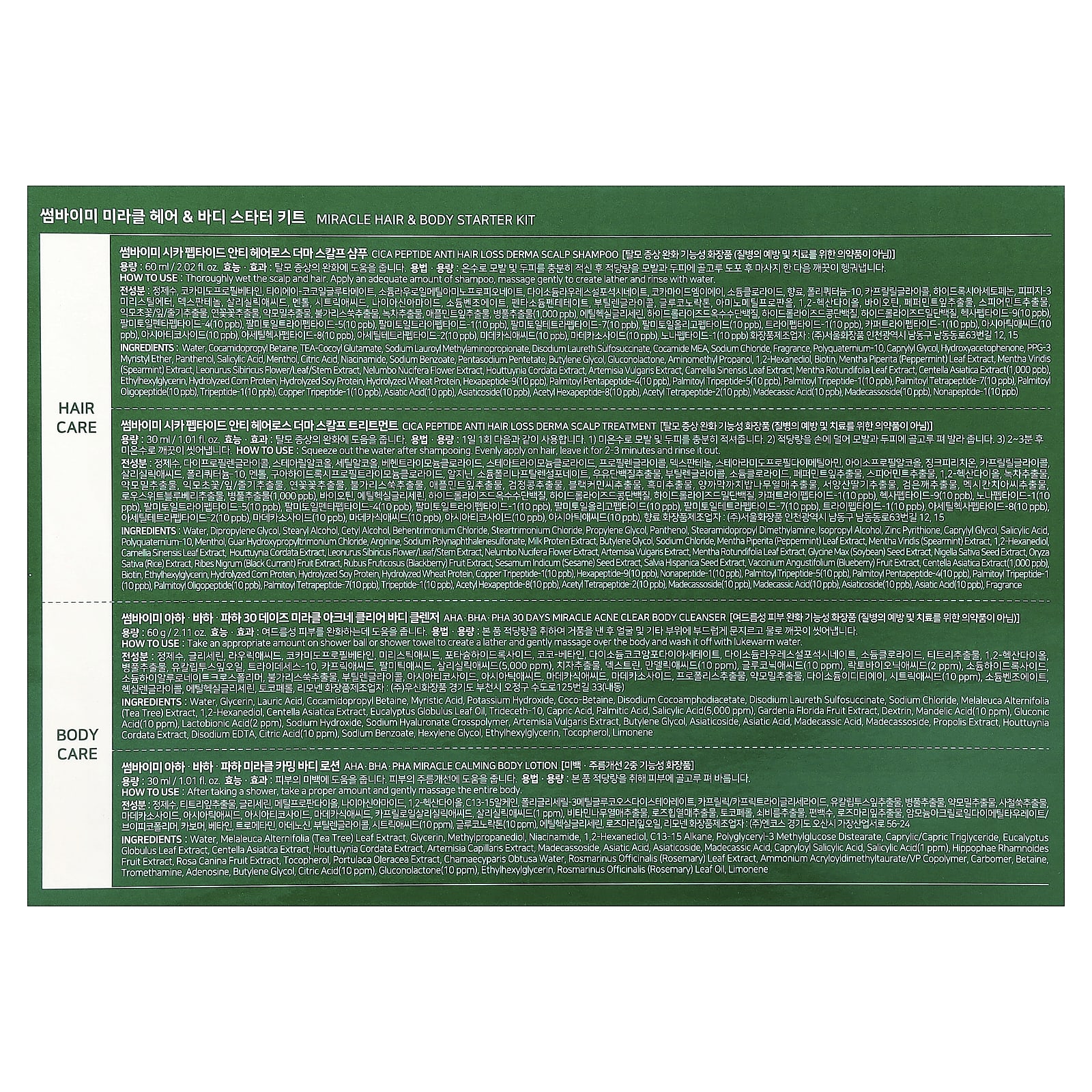 AHA, BHA, PHA, Miracle, Loção Corporal Calmante: Água, extrato da folha de Melaleuca alternifolia (melaleuca), glicerina, methylpropanediol, nicotinamida, 1,2-hexanediol, alcano c13-15, polyglyceryl-3 methylglucose distearate, caprylic/capric triglyceride, extrato da folha de Eucalipto globulus, extrato de Centella asiatica, extrato de Houttuynia cordata, extrato de Artemisia capillaris, madecassoside, asiatic acid, asiaticosídeo, ácido madecássico, capryloyl salicylic acid, ácido salicílico (1 ppm), extrato da fruta de Hippophae rhamnoides, extrato da fruta de Rosa canina, tocoferol, extrato de Portulaca oleracea, água de Chamaecyparis obtusa, extrato da folha de Rosmarinus officinalis (alecrim), ammonium acryloyldimethyltaurate/vp copolymer, carbômero, betaína, trometamol, adenosina, butilenoglicol, ácido cítrico (10 ppm), gluconolactone (10 ppm), ethylhexylglycerin, óleo da folha de Rosmarinus officinalis (alecrim), limoneno.