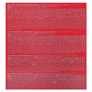 Gel de Limpeza com pH Baixo Snail Truecica Miracle Repair: Água, lauryl hydroxysultaine, disodium cocoamphodiacetate, cloreto de sódio, potassium cocoyl glycinate, acrylates copolymer, sodium methyl cocoyl taurate, butilenoglicol, cocoato de pésássio, secreção filtrada de caracol (9.940 ppm), benzyl glycol, ácido cítrico, óleo da fruta de Citrus aurantium bergamia (bergamota), ethylhexylglycerin, hexylene glycol, edetato dissódico, óleo de Salvia officinalis (sálvia), suco de Betula platyphylla japonica, extrato da raiz de Glycyrrhiza glabra (alcaçuz), extrato da folha de Camellia sinensis, extrato de Agrimonia eupatoria, pantenol, 1,2-hexanediol, extrato de Centella asiatica (200 ppm), extrato da folha de Perilla frutescens, extrato da folha de Melaleuca alternifolia (melaleuca) (100 ppm), fenoxietanol, glicina, dimetildietilenoglicol, extrato de Saponaria officinalis, serina, ácido glutâmico, extrato da fruta de Kigelia africana, ácido aspártico, caprylic/capric triglyceride, leucina, alanina, lisina, arginina, asiaticosídeo (4 ppm), tirosina, fenilalanina, ácido asiático (3 ppm), ácido madecássico (3 ppm), treonina, prolina, valina, isoleucina, pentilenoglicol, à lecitina, extrato da raiz de Platycodon grandiflorus, extrato de Poria cocos, extrato da semente de Coix lacryma-jobi ma-yuen, extrato da raiz de Paeonia albiflora, histidina, madecassoside (1 ppm), cisteína, metionina, extrato de Polygonatum odoratum, extrato da raiz de Scutellaria baicalensis, extrato da raiz de Astragalus membranaceus, extrato de Angelica gigas, extrato da fruta de Cornus officinalis, extrato de Artemisia vulgaris (50 ppm), extrato da raiz de Rehmannia glutinosa, ceramida NP, lisado do fermento de bífida, lisado do fermento de lactobacilos, lisado de fermento de Lactococcus, limoneno, linalol.