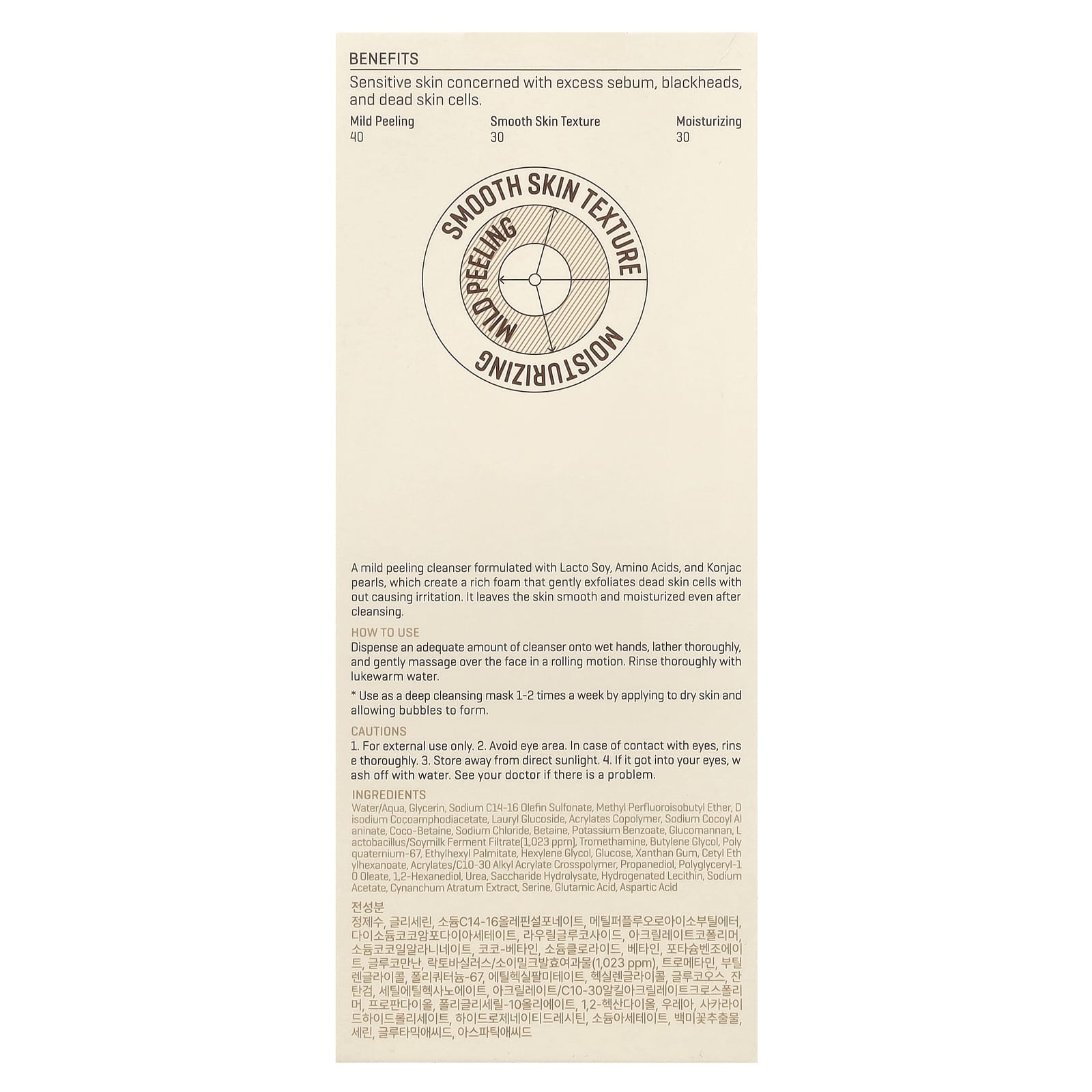 Um esfoliante de limpeza suave formulado com Lacto de Soja, Aminoácidos e pérolas de Konjac, que criam uma espuma abundante que esfolia suavemente as células mortas da pele sem causar irritação.