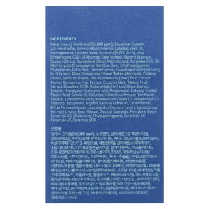 hidrogenada, lecitina, betasitosterol (5.000 ppm), dimeticona de vinil, álcoois c12-16, álcool cetílico, monoestearato de glicerila, citrato de sódio, dipropilenoglicol, ácido palmítico, acrilatos/c10-30 alkyl acrylate crosspolymer, goma xantana, ethylhexylglycerin, fitoesteróis, ácido cítrico, trometamol, extrato da fruta de Musa Sapientum [banana], água da flor de Rosa damascena, adenosina, estearil olivate, sorbitano olivate, extrato da fruta de Pyrus communis [pera], extrato da fruta de Prunus domestica, extrato da fruta de Cucumis melo (melão), edetato dissódico, extrato de folha/caule de Hedera helix (hera), betaína, ácido hialurônico hidrolisado, propanodiol, álcool cetoestearílico, ácido esteárico, óleo de canola, celulose, óleo da semente de Helianthus annuus (girassol), óleo da semente de Limnanthes alba (meadowfoam), estearato de poliglicerila-10, tocoferol, óleo do grão de Argania spinosa, ceramida np, lisado de fermento de bífida, lisado de fermento de Lactobacillus, lisado de fermento de Lactococcus, betaglucano, caprilato de glicerila, pentilenoglicol, ceramida NS, colesterol, fitoesfingosina, ceramida AP, ceramida AS, ceramida EOP.