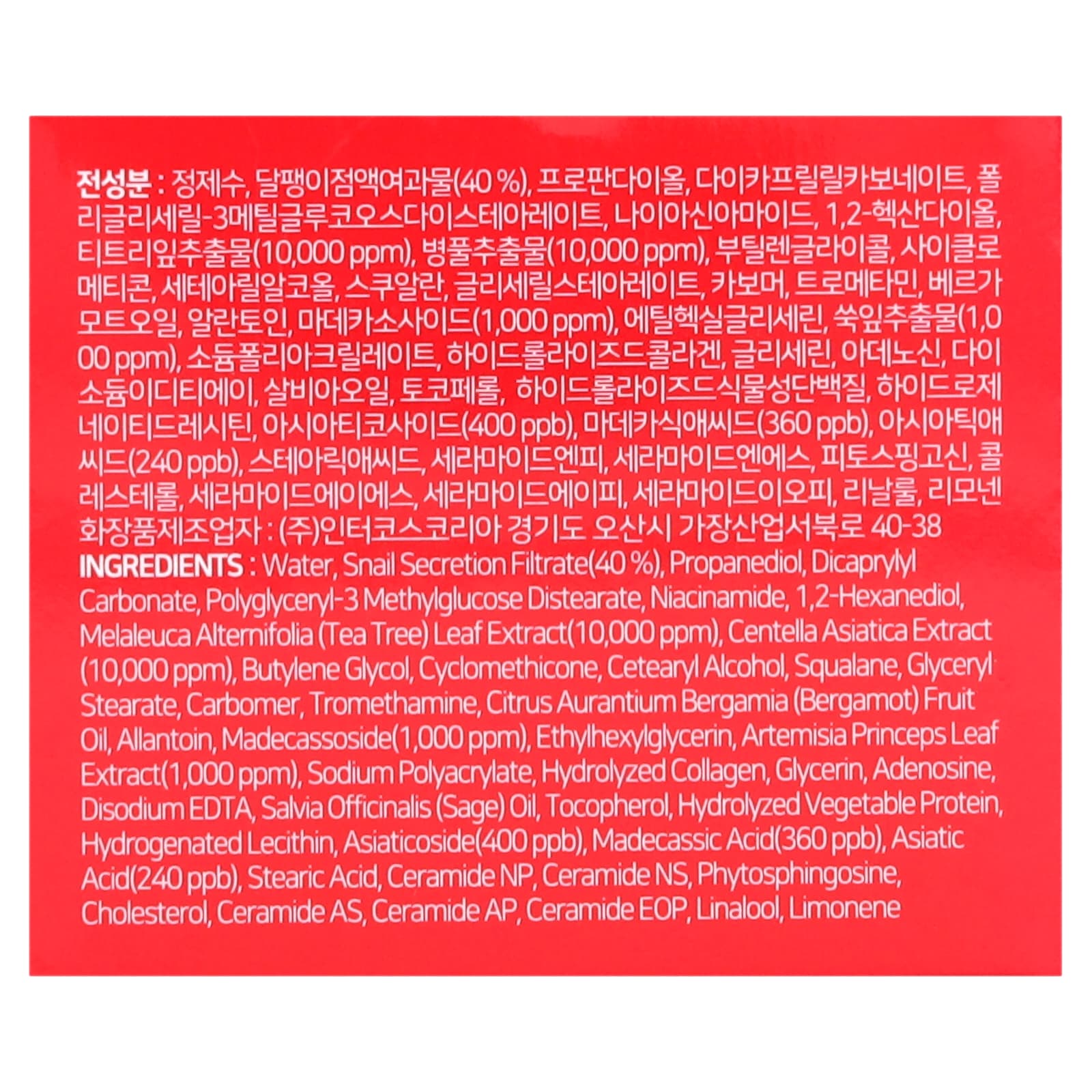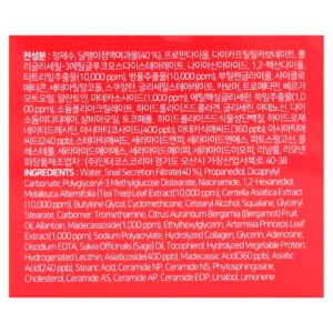 Água, secreção filtrada de caracol (40%), propanediol, carbonato de dicaprililo, polyglyceryl-3 methylglucose distearate, ácido nicotínico, 1,2-hexanediol, extrato da folha de Melaleuca alternifolia (melaleuca) (10.000 ppm), extrato de Centella asiatica (10.000 ppm), butilenoglicol, ciclometicona, álcool cetoestearílico, esqualano, monoestearato de glicerila, carbômero, trometamol, óleo da fruta de Citrus aurantium bergamia (bergamota), alantoína, madecassoside (1.000 ppm), ethylhexylglycerin, extrato da folha de Artemisia princeps (1.000 ppm), sodium polyacrylate, colágeno hidrolisado, glicerina, adenosina, edetato dissódico, óleo de Salvia officinalis (sálvia), tocoferol, proteína vegetal hidrolisada, lecitina hidrogenada, asiaticosídeo (400 ppb), ácido madecássico (360 ppb), ácido asiático (240 ppb), ácido esteárico, ceramide np, ceramide ns, phytosphingosine, colesterol, ceramide as, ceramida AP, ceramida EOP, linalol, limoneno