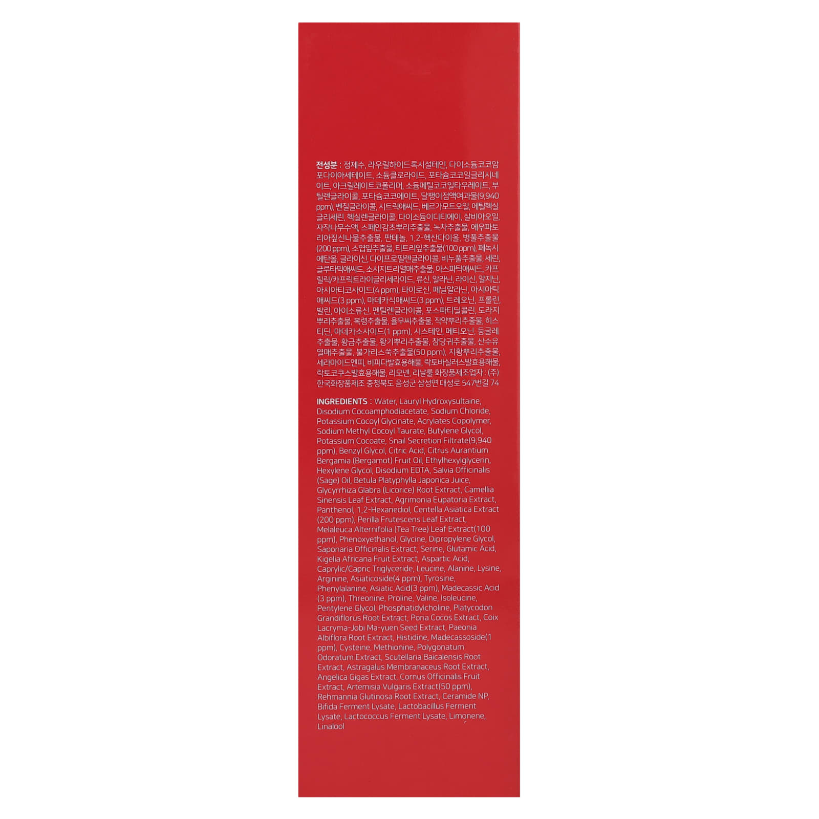 Água, lauril hidroxisultaína, disodium cocoamphodiacetate, cloreto de sódio, potassium cocoyl glycinate, copolímero de acrilatos, sodium methyl cocoyl taurate, butilenoglicol, cocoato de potássio, secreção filtrada de caracol (9.940 ppm), benzyl glycol, ácido cítrico, óleo da fruta Citrus aurantium bergamia (bergamota), ethylhexylglycerin, hexylene glycol, edetato dissódico, óleo de Salvia officinalis (sálvia), suco de Betula platyphylla japonica, extrato da raiz de Glycyrrhiza glabra (alcaçuz), extrato da folha de Camellia sinensis, extrato de Agrimonia eupatoria, pantenol, 1,2-hexanediol, extrato de Centella asiatica (200 ppm), extrato da folha de Perilla frutescens, extrato da folha de Melaleuca alternifolia (melaleuca) (100 ppm), fenoxietanol, glicina, dimetildietilenoglicol, extrato de Saponaria officinalis, serina, ácido glutâmico, extrato da fruta de Kigelia africana, ácido aspártico, caprylic/capric triglyceride, leucina, alanina, lisina, arginina, asiaticosídeo (4 ppm), tirosina, fenilalanina, ácido asiático (3 ppm), ácido madecássico (3 ppm), treonina, prolina, valina, isoleucina, pentilenoglicol, à lecitina, extrato da raiz de Platycodon grandiflorus, extrato de Poria cocos, extrato da semente de Coix lacryma-jobi ma-yuen, extrato da raiz de Paeonia albiflora, histidina, madecassoside (1 ppm), cisteína, metionina, extrato de Polygonatum odoratum, extrato da raiz de Scutellaria baicalensis, extrato da raiz de Astragalus membranaceus, extrato de Angelica gigas, extrato da fruta de Cornus officinalis, extrato de Artemisia vulgaris (50 ppm), extrato da raiz de Rehmannia glutinosa, ceramide np, lisado do fermento de bífida, lisado do fermento de lactobacilos, lisado do fermento de Lactococcus, limoneno, linalol.