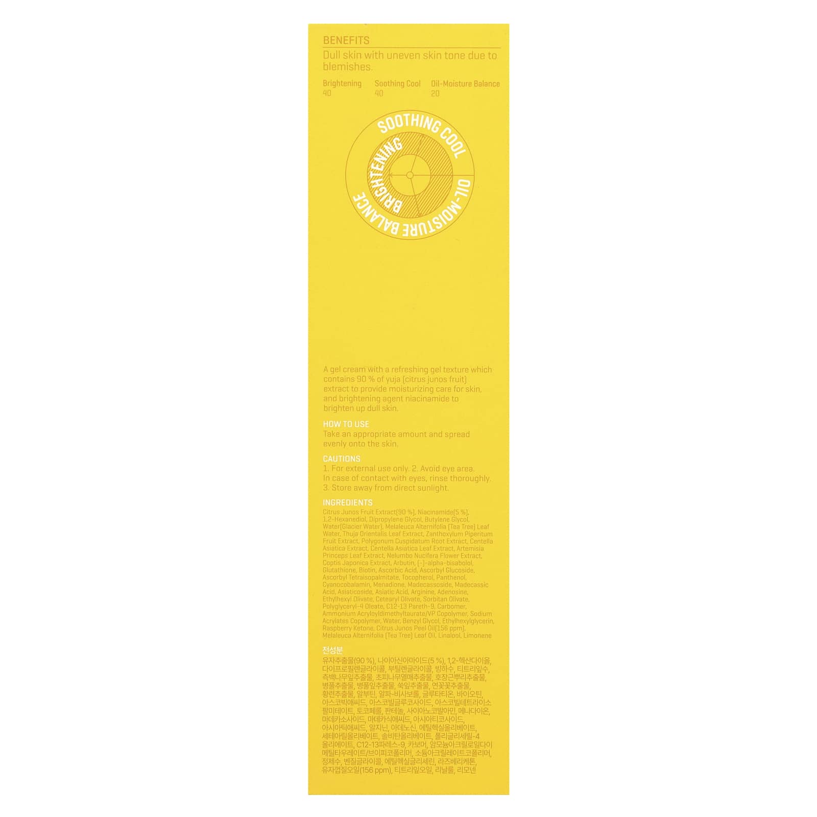Um creme em gel com uma textura de gel refrescante que contém 90% de extrato de yuja (fruta de Citrus junos] para fornecer cuidados hidratantes à pele e o agente iluminador nicotinamida para iluminar a pele opaca.