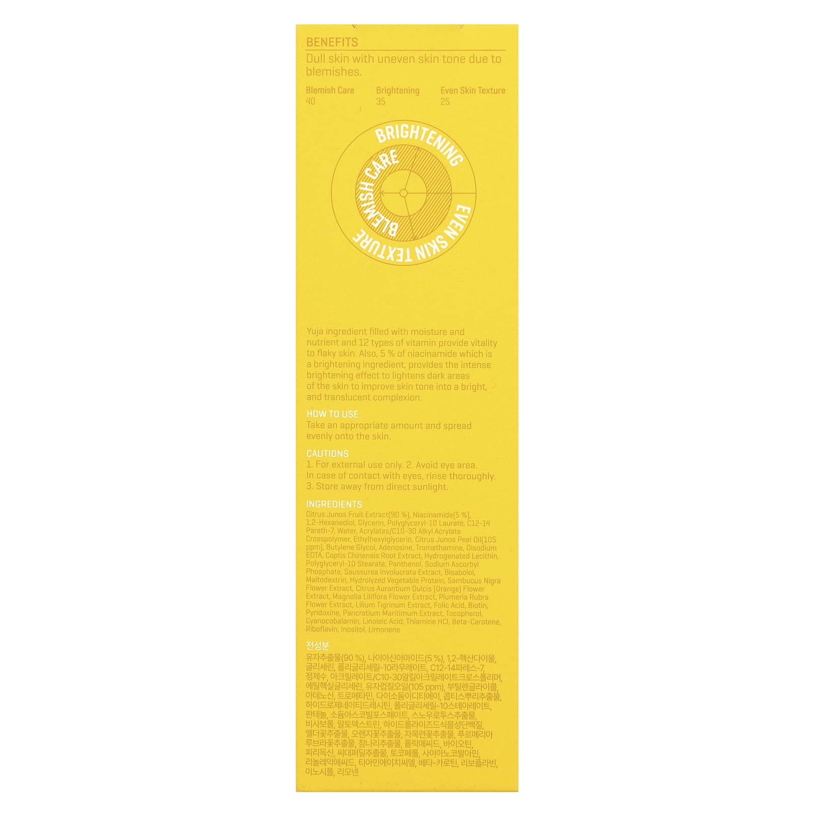 A Nicotinamida a 5% proporciona um efeito iluminador. Os ingredientes Yuja e 12 vitaminas revitalizam a pele para uma pele iluminada e transparente.