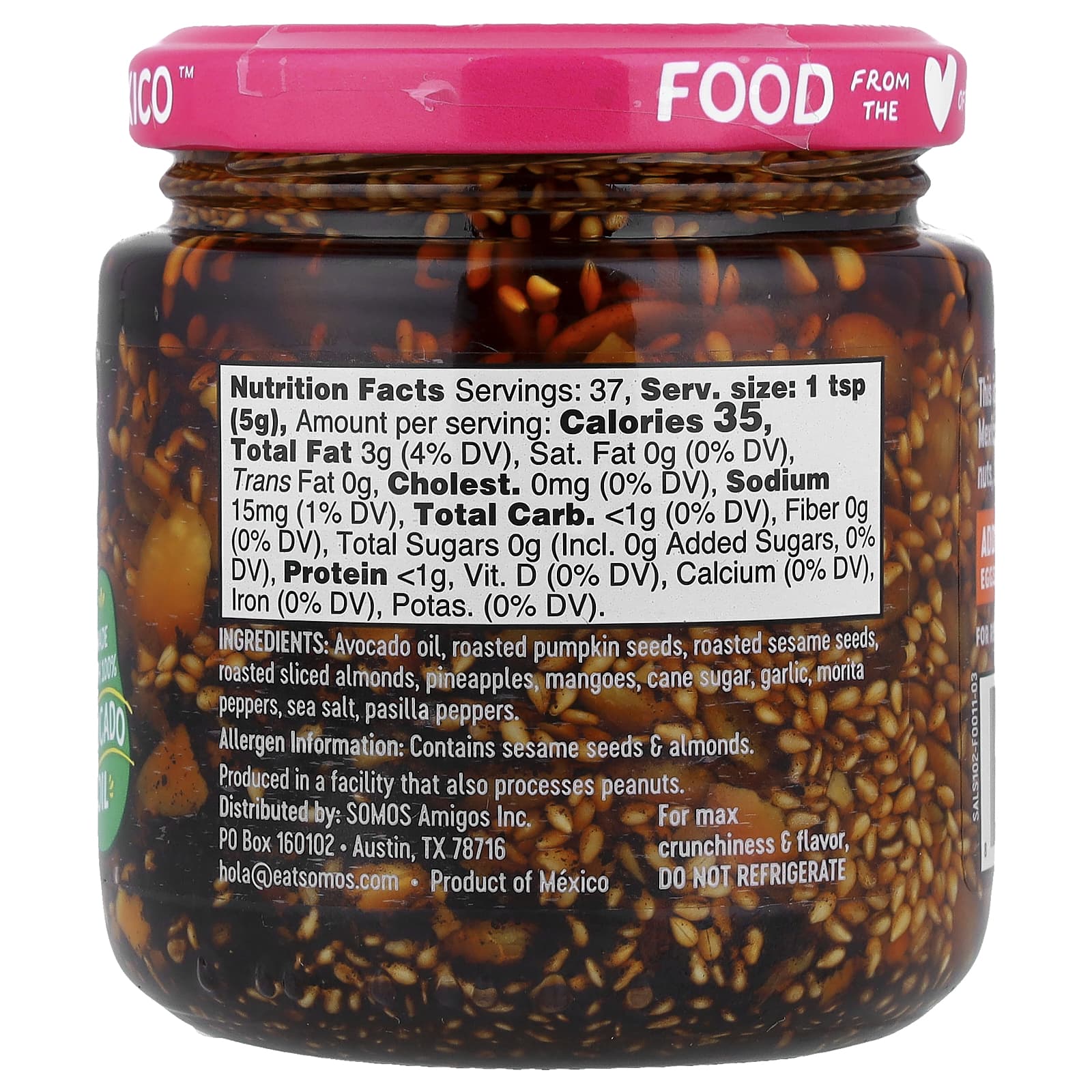 Óleo de abacate, sementes de abóbora torradas, sementes de gergelim torrado, amêndoas torradas em fatias, abacaxis, mangas, açúcar de cana-de-açúcar, alho, pimentas morita, sal marinho, pimentão pasilla.