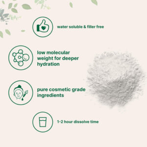 Solúvel em água em 2 horas, pode ajudar a hidratar a pele seca ou envelhecida e apagar as rugas. –