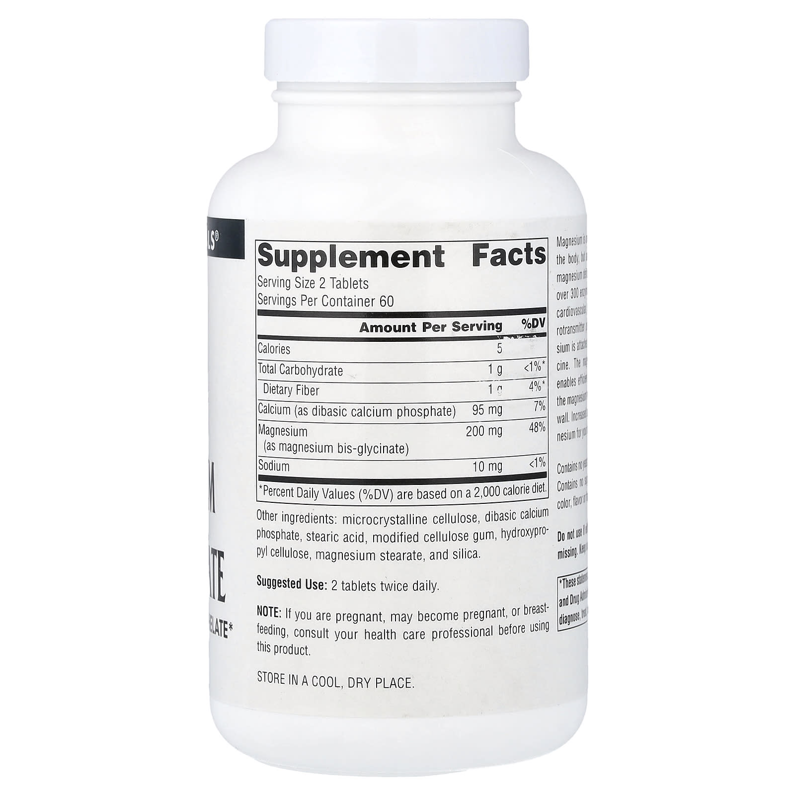 O magnésio é um dos minerais mais importantes do corpo, mas cerca de 75% dos norte-americanos têm deficiência de magnésio. O magnésio desempenha um papel fundamental em mais de 300 reações enzimáticas, incluindo o suporte a processos cardiovasculares, ósseos, musculares, energéticos e neurotransmissores. O magnésio da Source Naturals é ligado (“quelado”) ao aminoácido glicina. A combinação de bis-glicinato de magnésio permite uma absorção eficiente e o glicinato permite que o magnésio seja facilmente transferido pela parede intestinal. Maior absorção significa mais magnésio utilizável para as necessidades do seu corpo.