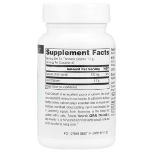O Cálcio Coral é uma excelente fonte de cálcio, o mineral mais abundante em nossos corpos. Além de construir ossos saudáveis, o cálcio desempenha funções essenciais nas contrações musculares, nos batimentos cardíacos, na coagulação do sangue, na transmissão nervosa e na conversão de sinais dos hormônios em ações dentro das células. O Cálcio da Source Natural Coral é ecológico: É colhido de corais fossilizados (mortos) e não é prejudicial para os corais vivos.