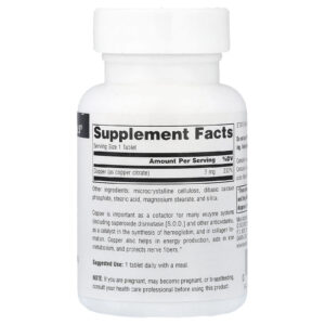 O Cobre é importante como um cofator para muitos sistemas enzimáticos (incluindo superoxide dismutase [SOD] e outros antioxidantes) como um catalisador na síntese de hemoglobina e na formação de colágeno. O Cobre também auxilia na produção de energia, auxilia no metabolismo do ferro e protege as fibras nervosas.