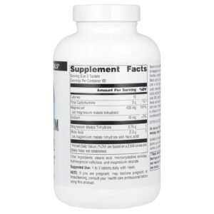 O Malato de Magnésio da Source Naturals é um composto de magnésio e ácido málico. Ele contribui para a função muscular, a saúde cardiovascular e a produção de energia adequadas. O ácido málico é um ácido natural de fruta que está presente na maioria das células do corpo e é um intermediário no ciclo de Krebs, em que a energia é capturada durante o metabolismo dos carboidratos e das gorduras. O magnésio é um cofator essencial para mais de 300 reações enzimáticas no metabolismo, na síntese de ATP e na produção de energia. O magnésio desempenha funções importantes no relaxamento muscular porque atua como cofator para enzimas e tem a capacidade de equilibrar o cálcio na célula.