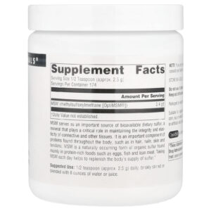 O MSM atua como uma fonte importante de enxofre biodisponível na dieta, um mineral que desempenha uma função fundamental na manutenção da integridade e da elasticidade dos tecidos conjuntivos e outros tecidos. É um componente importante das proteínas encontradas em todo o corpo, como nos cabelos, nas unhas, na pele e nos tendões. O MSM é uma forma natural de enxofre orgânico encontrada principalmente em alimentos ricos em proteínas, como ovos, peixes e carnes magras. Tomar MSM diariamente ajuda a repor o suprimento de enxofre do corpo.