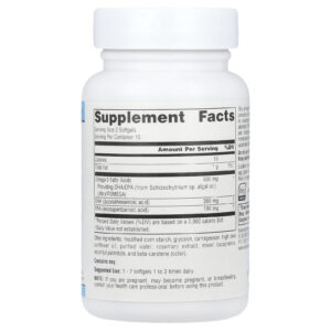 Este produto totalmente vegano é uma fonte superior de EPA e DHA em comparação com o óleo da semente de linhaça ou outras fontes vegetarianas de ômega-3. Uma alternativa vegetariana excepcional ao óleo de peixe, este produto não deixa gosto residual de peixe. O EPA/DHA contribui para o funcionamento saudável do cérebro e do sistema cardiovascular. O DHA é parte integrante dos fosfolipídios da membrana neural no cérebro. Feito de algas, também é uma alternativa sustentável à pesca excessiva nos oceanos.