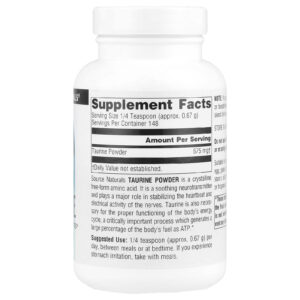 O Pó de Taurina da Source Naturals é um aminoácido de forma livre, cristalino. É um neurotransmissor tranquilizante e desempenha um papel importante na estabilização do batimento cardíaco e atividade elétrica dos nervos. A taurina também é necessária para o bom funcionamento do ciclo de energia do corpo, um processo extremamente importante que gera uma grande porcentagem de combustível do corpo como ATP.