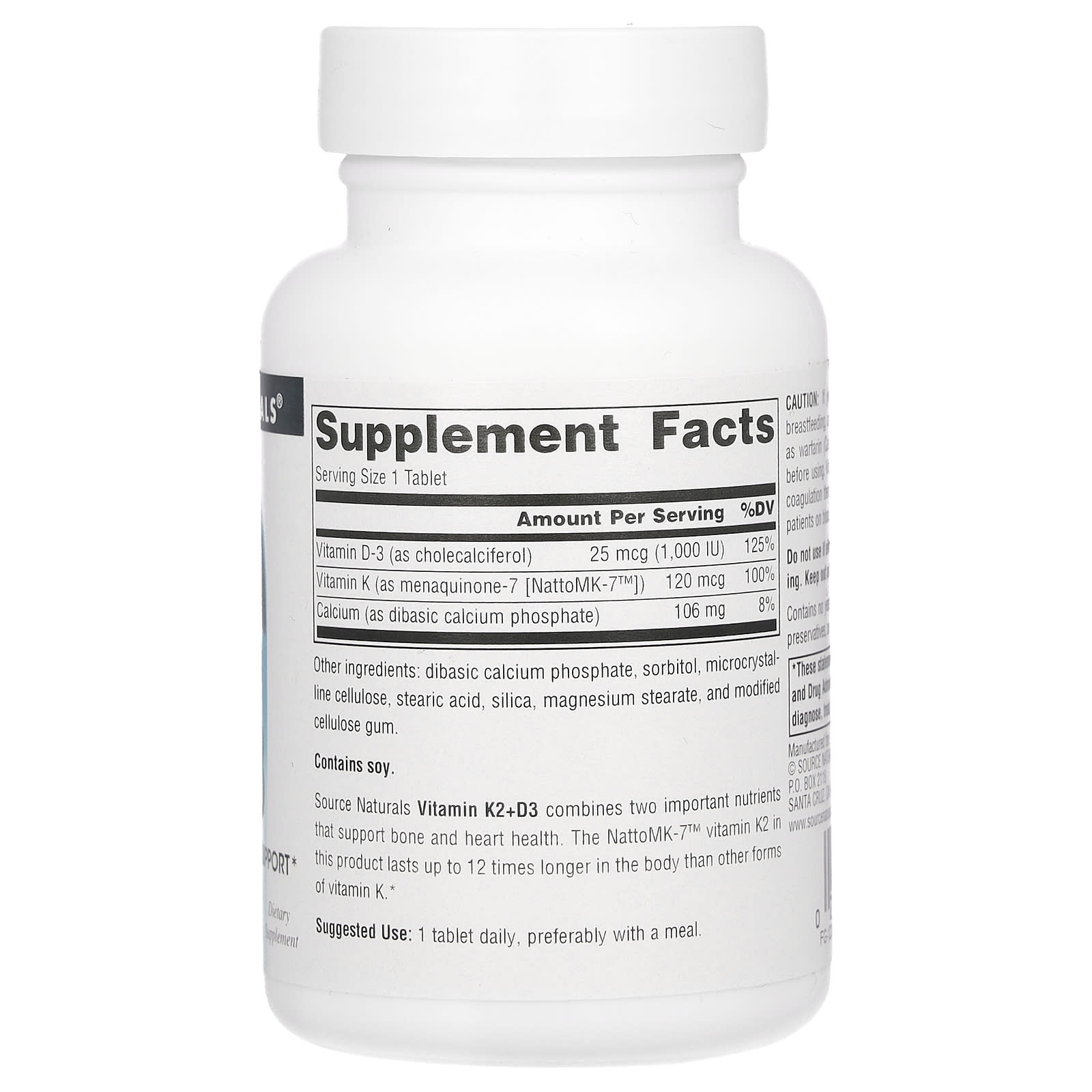 A Vitamina K2+D3 da Source Naturals® combina dois nutrientes importantes que contribuem para a saúde dos ossos e do coração. A vitamina K2 Natto MK-7™ neste produto permanece até 12 vezes mais no corpo do que outras formas de vitamina K.