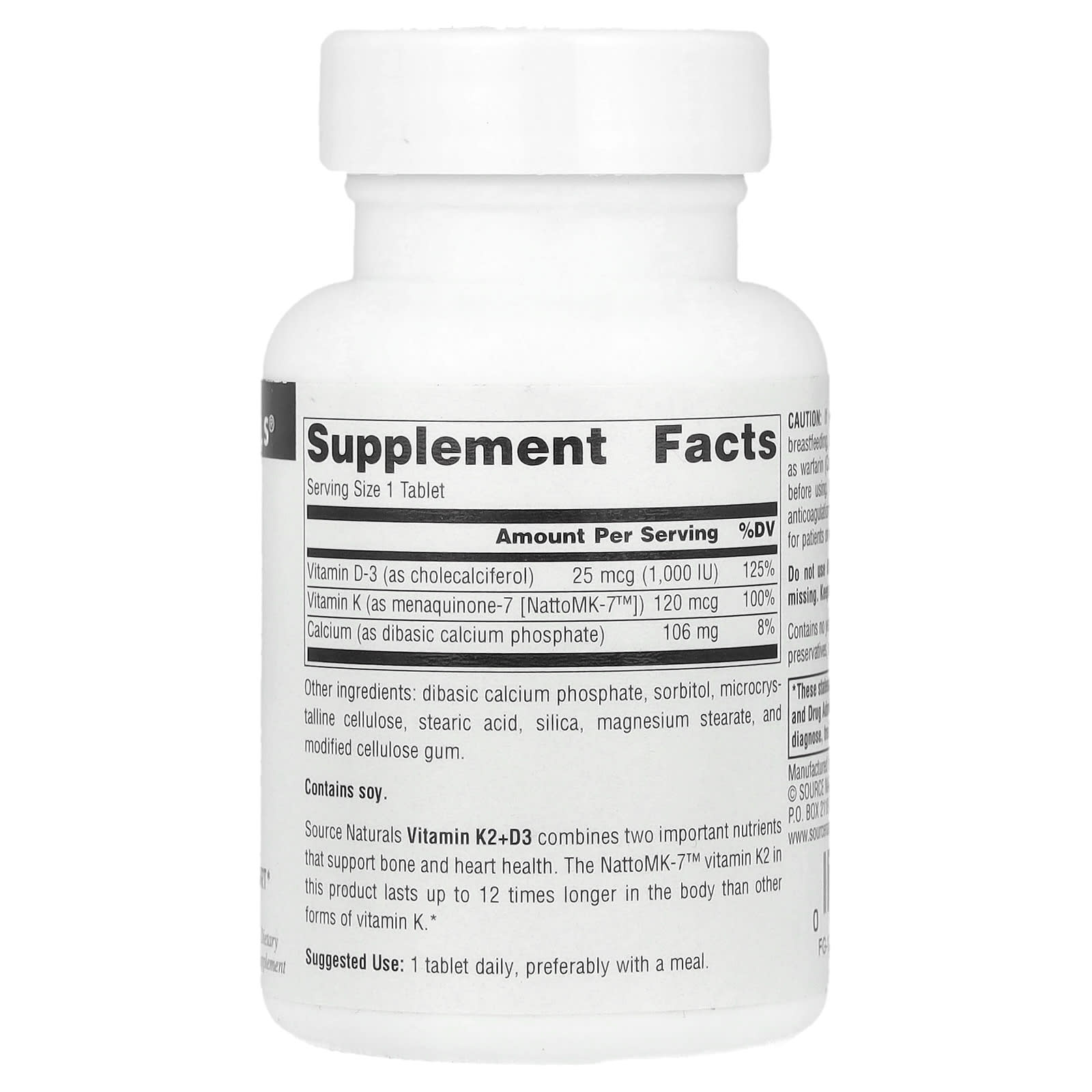 A Vitamina K2+D3 da Source Naturals combina dois nutrientes importantes que contribuem para a saúde dos ossos e do coração. A vitamina K2 NattoMK-7™ neste produto permanece até 12 vezes mais no corpo do que outras formas de vitamina K.