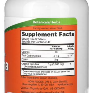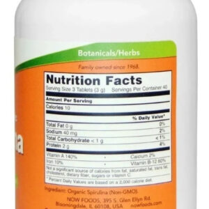 A espirulina é uma microalga verde-azulada com proteína de ocorrência natural, além de outros nutrientes como vitaminas, minerais e GLA (ácido gama-linolênico). Os comprimidos de Espirulina Orgânica Certificada da NOW® são puros e não contêm excipientes, aglutinantes nem aditivos.