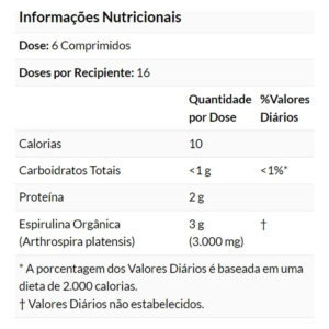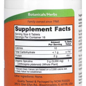 Cada tablete contém 500mg de Spirulina Orgânica, Now Foods é rigorosa na produção de seus produtos, garantindo a mais alta qualidade e pureza para vegetarianos e veganos. Outros Ingredientes: Dióxido de Silício. Tome 6 comprimidos por dia.;