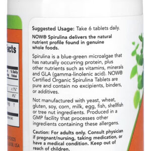 Cada tablete contém 500mg de Spirulina Orgânica, Now Foods é rigorosa na produção de seus produtos, garantindo a mais alta qualidade e pureza para vegetarianos e veganos. Outros Ingredientes: Dióxido de Silício. Tome 6 comprimidos por dia.;