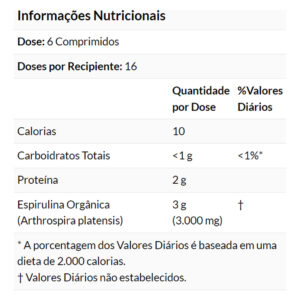 Os tabletes são formulados para uma absorção rápida pelo organismo, proporcionando o máximo aproveitamento dos benefícios da spirulina, bem como são fáceis de engolir. Fabricado sem ingredientes de fermento, trigo, glúten, soja, milho, leite, ovo, peixe, marisco, nozes ou gergelim.;