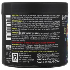Para Obter Melhores Resultados: Não use Sweet Sweat com nenhum creme ou loção para a pele, pois isso cria uma barreira tópica que inibe os resultados do Sweet Sweat. Sweet Sweat deve ser usado com roupas soltas para evitar atrito e aumentar a “respiração”. Sweet Sweat também pode ser usado na água e em Saunas Secas ou de Infravermelho. Para obter melhores resultados, use com os Aparadores de Neoprene da Sweet Sweat.