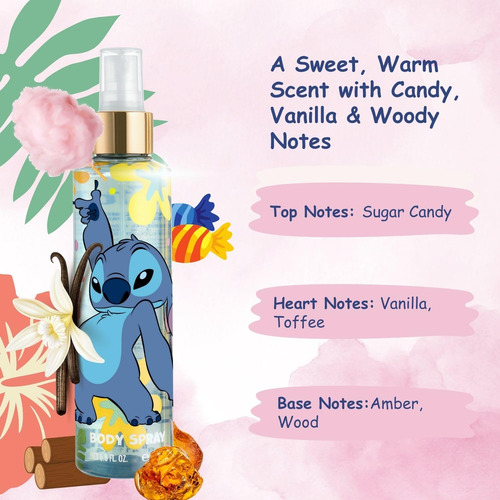 Disney Stitch 6.7 Body Spray U (125898) – Tipo de fragrância: aroma doce, tropical e quente. – Notas principais: coco, figo. – Notas de coração: Orris.