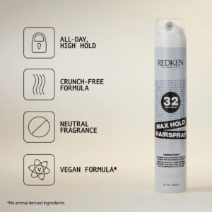 Spray de cabelo neutro Redken Max Hold 32 | Spray de cabelo Extreme Maximum High Hold | Controle de elevação e frizz de longa duração | Para todos os tipos de cabelo | Fragrância neutra – Spray de cabelo Maximum Hold: Redken Triple Pure 32 O spray de cabelo Extreme High Hold é um spray de cabelo de alta retenção de fragrância neutra que oferece controle máximo de qualquer estilo de cabelo com proteção antifrizz e umidade de 24 horas sem crocância ou viscosidade – Fórmula ultra forte: a fórmula de retenção máxima do Triple Pure 32 um perfume neutro e é perfeito para domar o frizz e o brilho de seus estilos elegantes, como um rabo de cavalo alto – Principais benefícios: O spray de cabelo Triple Pure 32 oferece uma fixação extrema. Tem uma fórmula neutra e sem perfume. Ele fornece retenção durante todo o dia, mantendo a flexibilidade sem adicionar crocância ou viscosidade, ao mesmo tempo em que protege contra a umidade. Uso sugerido: mantenha o Triple Pure a 32 a 6-12 polegadas de distância e pulverize nos cabelos secos e estilizados. Reaplique para uma retenção adicional. Enxágue o bico com água morna se ocorrer entupimento – Qualidade em que você pode confiar: modele seu cabelo em casa como os profissionais, com os favoritos de salão da Redken