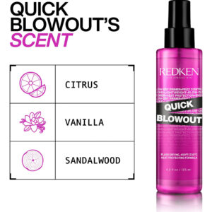 Redken Quick Blowout é um spray leve que reduz o tempo de secagem sem sacrificar os resultados. Este spray reduz o tempo de secagem, protege o cabelo dos danos causados pelo calor e contém óleos ricos para controlar o frizz e nutrir o cabelo. Este spray leve é levemente perfumado com uma mistura de madeiras cítricas, florais e macias.