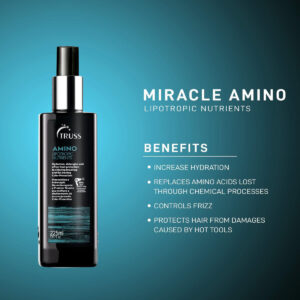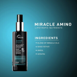Spray protetor térmico para cabelo TRUSS Professional Amino Miracle — poderoso tratamento antienvelhecimento e spray desembaraçador para condicionar profundamente + Smooth Knots (225 ml) — Defesa térmica poderosa — Criamos o spray de proteção térmica Amino para cabelos que precisam de um pouco mais de amor antes e durante o penteado térmico. Nossa fórmula pode ser usada para proteger suas madeixas contra danos, portanto, certifique-se de usá-la como protetor de cabelo antes de trabalhar com qualquer ferramenta quente. – Reparar + Proteger – Este tratamento que deixa os cabelos crespos usa aminoácidos e proteínas de queratina para ajudar a aumentar a elasticidade e suavizar os cabelos crespos. Da mesma forma, nosso sistema Color Lock ajudará a selar a cutícula para evitar que a cor do cabelo desbote, para que cada mecha fique mais brilhante, saudável e vibrante. – Condição + Desembaraçar – Você pode usar este spray desembaraçador suave como tratamento diário para cabelos danificados, para que ele possa suavizar os emaranhados que geralmente causam quebras. Além disso, com controle adicional de frizz e proteção contra umidade, é uma ótima opção para cabelos cacheados ou ondulados. – Como usar – Se você estiver usando esse spray protetor térmico em cabelos secos, certifique-se de borrifá-lo em toda a cabeça, mas concentre-se especialmente nas pontas. Se você estiver trabalhando com mechas limpas e úmidas, basta borrifar o produto, massagear e secar com secador para obter um cabelo saudável e brilhante. – Confie na TRUSS – Hoje, os produtos de tratamento capilar TRUSS podem ser encontrados em mais de 22 países. Eles são usados em todo o mundo em uma ampla variedade de salões para fazer de tudo, desde garantir proteção térmica segura para modelar o cabelo até suavizar os nós como um spray nutritivo para desembaraçar.
