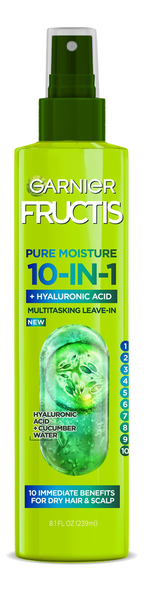 Spray Garnier Fructis Pure Moisture 10 em 1 para cabelos e couro cabeludo secos, ácido hialurônico, 8,1 oz, 1 unidade (a embalagem pode variar) — Formulado com ácido hialurônico e água de pepino, fornece um aumento profundo de hidratação e até 72 horas de umidade para cabelos secos e couro cabeludo seco quando usado com nosso xampu e condicionador — Entre os benefícios 10 em 1 estão reidrata entre as lavagens, dá brilho e adiciona suavidade, adiciona volume, spray desembaraçador, sem resíduos e sem peso – Garnier está comprometida com a beleza ecológica – nossos frascos, exceto bombas e tampas, são feitos de material 100% reciclado Plástico — sem parabenos, sem silicone — certificado Leaping Bunny, livre de crueldade e vegano
